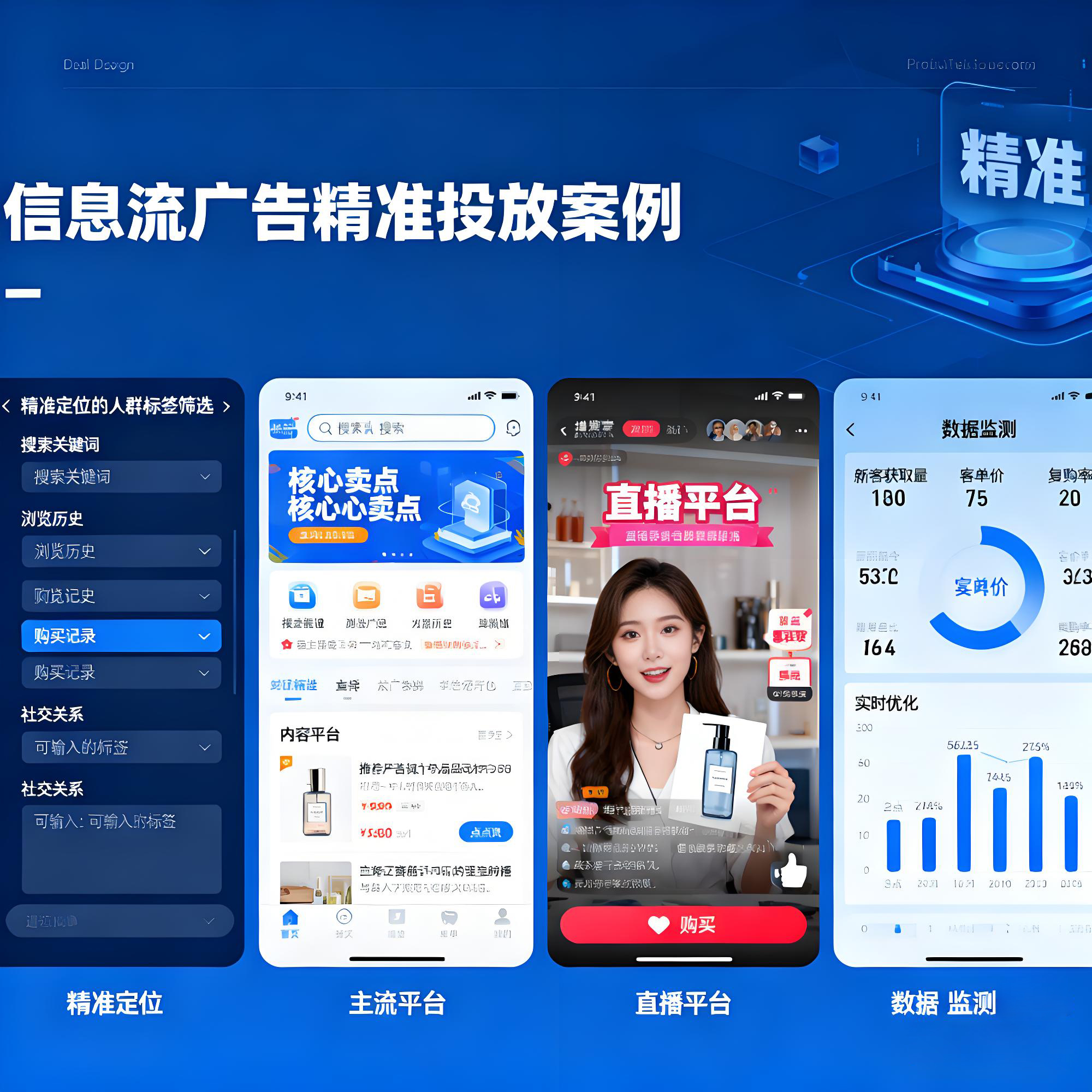 信息流广告精准投放案例,通过精准定位(基于搜索关键词、浏览历史、购买记录、社交关系等多维度人群标签筛选)、在主流平台与直播平台进行广告内容适配投放,再结合数据监测(新客获取、客单价、复购率等数据实时追踪与优化),实现广告精准触达目标用户并提升转化效果。¥ 0.00立即购买